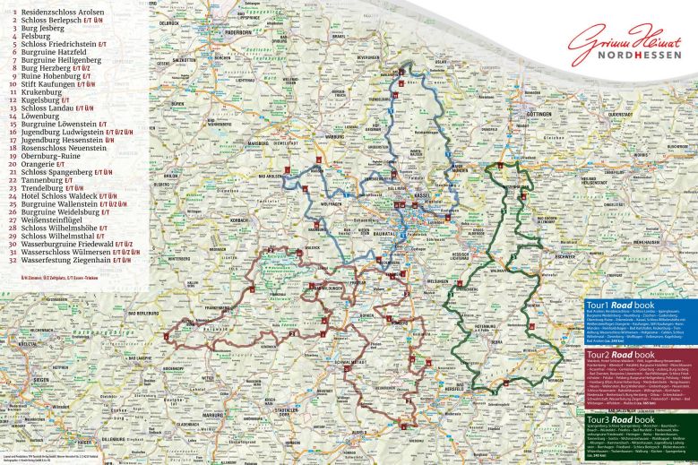 Die drei in dieser Karte vorgeschlagenen Burgen & Schlösser-Touren kommen einer Zeitreise gleich: Sie führen den Besucher durch die märchenhafte und abwechslungsreiche Landschaft Nordhessens - über bewaldete sanfte Hügel, vorbei an Feldern, kleinen Flussläufen und durch urige Fachwerkdörfer. Die in der jeweiligen Tour empfohlenen historischen Anlagen überraschen durch ihren individuellen Charme wie weite Aussichten, spannende Führungen, kulinarische Köstlichkeiten oder stilvolle Übernachtungsmöglichkeiten.